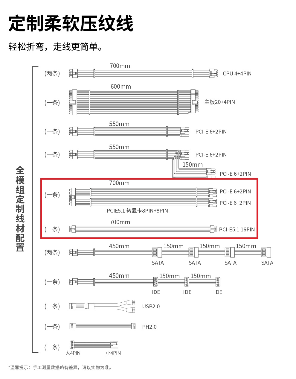 鑫谷此前推出了昆仑九重 KE-1300P 冰山版数字电源。该电源模组接线面板中包含 2 个 PCIe 5.1 12V-2×6 接口,但配备的线材中仅有一组原生 12V-2×6,另外一组是 12V-2×6 转双 PCIe 6+2 Pin。