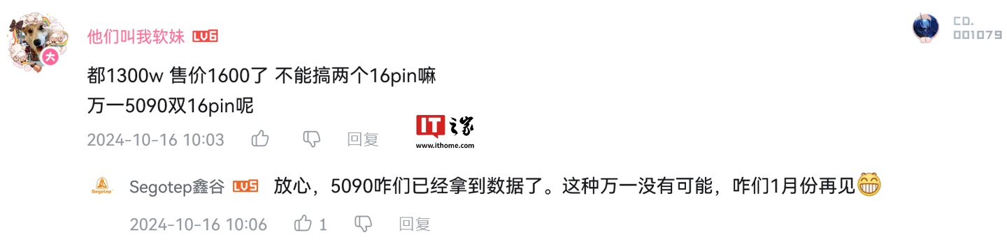 IT之家 10 月 21 日消息,鑫谷官方B站账户本月 16 日在 UP 主 喜欢就买JustBuy 视频下方的评论区表示已拿到英伟达 GeForce RTX 5090 的数据,该显卡没有采用双 16Pin 供电设计的“万一”可能。