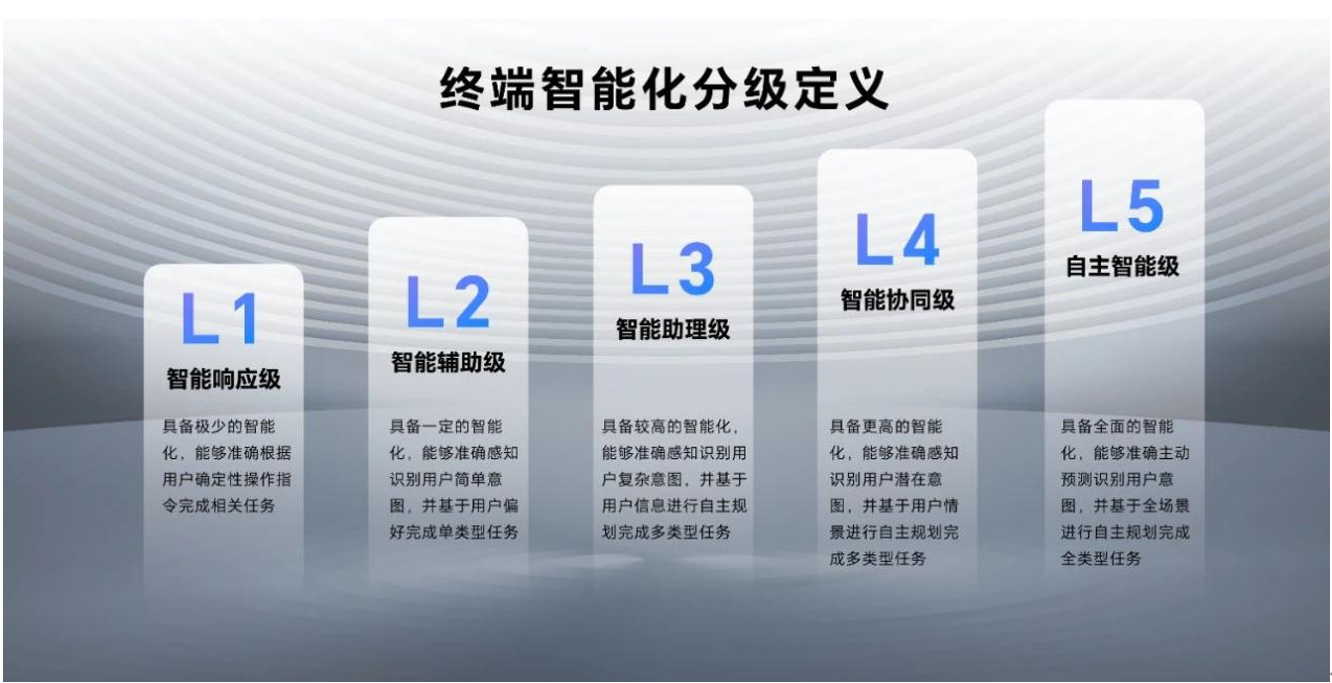 分级体系基于人与终端在任务中的协作关系,以应用场景为出发点,将终端智能化水平分为五个等级L1-L5。不同等级对应着人、终端不同的角色定位,智能化等级越高,终端自主参与度越高,人的参与度越低。L1级和L2级具备一定智能化,可以完成单类型任务。L3级和L4级逐步从感知识别复杂意图到识别潜在意图。L5级具备全面智能化,能够自主规划完成全类型任务。