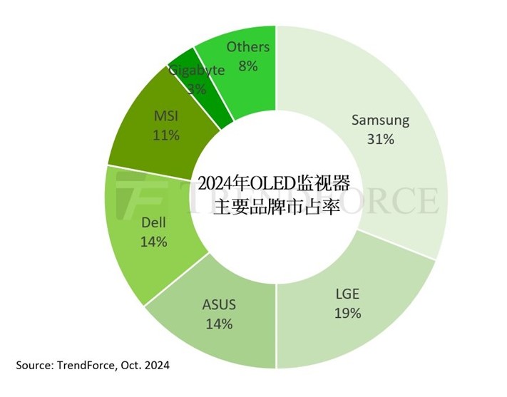 OLED 显示器市场主要品牌方面,2024 年六巨头预计将分别是最接近屏厂的三星电子(31%)与 LG 电子(19%)、显示领域耕耘已久的戴尔(14%)、三大台系板卡厂华硕(14%)与微星(11%)和技嘉(3%),其中戴尔、华硕市占率基本一致,剩余 8% 由其它厂商瓜分。