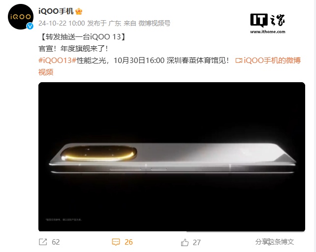 IT之家 10 月 22 日消息,iQOO 官方今日宣布,iQOO 13 将于 10 月 30 日 16:00 在深圳春茧体育馆发布。
