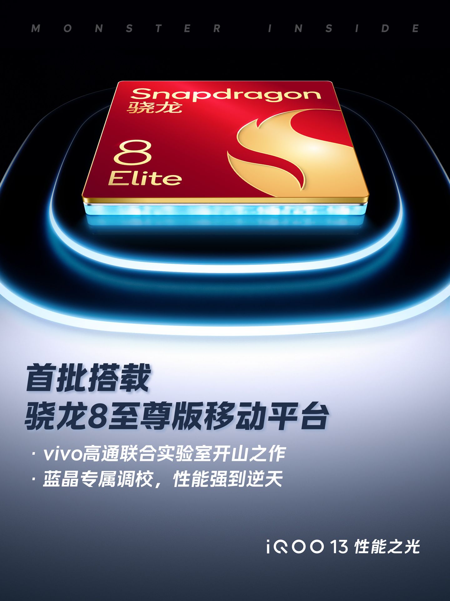 iQOO 13 首批搭载高通骁龙 8 至尊版移动平台,并采用蓝晶芯片技术栈专属调校,官方称“性能强到逆天”。