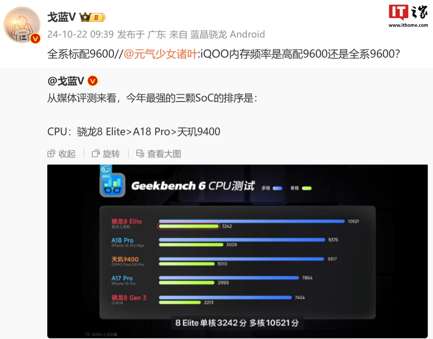 iQOO 产品经理 @戈蓝V 今日在微博透露,iQOO 13 手机全系标配 9600 内存(即 LPDDR5X-9600)。