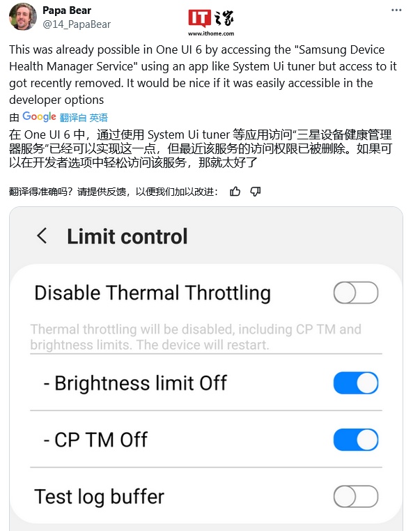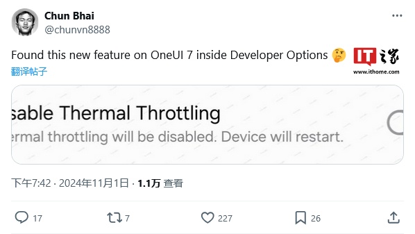 IT之家 11 月 2 日消息,消息源 @chunvn8888 昨日(11 月 1 日)在 X 平台发布推文,表示三星 One UI 7 的开发者选项中,将回归禁用温控调频(Disable Thermal Throttling)选项。