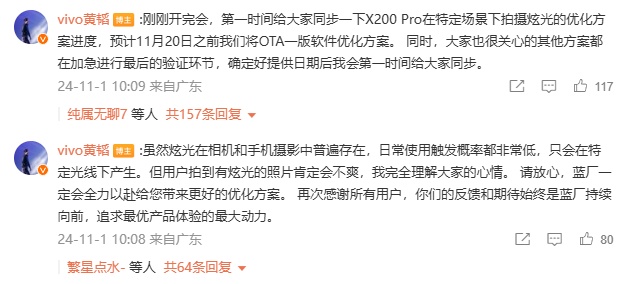 vivo 产品副总裁黄韬最新表示:预计将在 11 月 20 日之前为 X200 Pro 推送一次更新以优化缓解这一问题,其他方案都在加急验证中。
