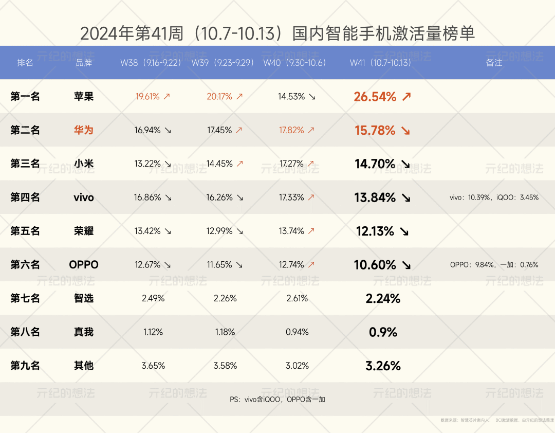 对于vivo来说,固守手机业务,确实可以避免太大的风险,但手机行业天花板渐显,以及竞争愈发激烈的现实,决定了 vivo 正面临巨大的下行压力。BCI数据显示,2024年第38周-41周,vivo手机市场份额从16.86%下滑至13.84%,下跌3.02个百分点。