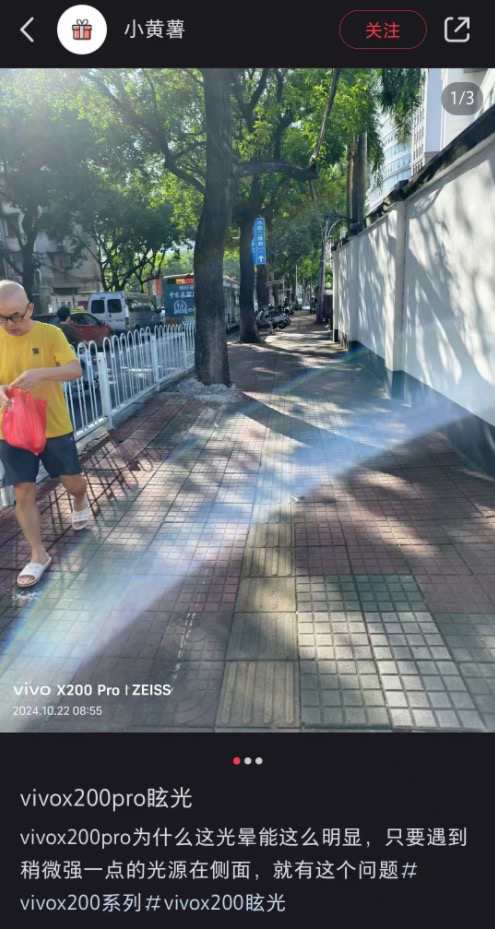 然而遗憾的是,尽管vivo X200 Pro的影像配置颇高,但其却连最基本的炫光都难以有效控制。近期,诸多拿到vivo X200 Pro的消费者在社交媒体平台发文称,该产品在部分场景下拍照,会出现明显炫光,非常影响拍照体验。