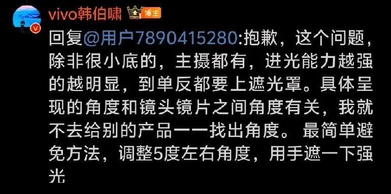 眼看着“炫光门”事件持续发酵,vivo并未第一时间站出来承担应有的责任,而是教育起了用户。vivo X系列产品总经理韩伯啸在社交媒体平台表示,炫光问题并非vivo X200 Pro独有,“最简单的避免方法,调整5度左右角度,用手遮一下强光。”