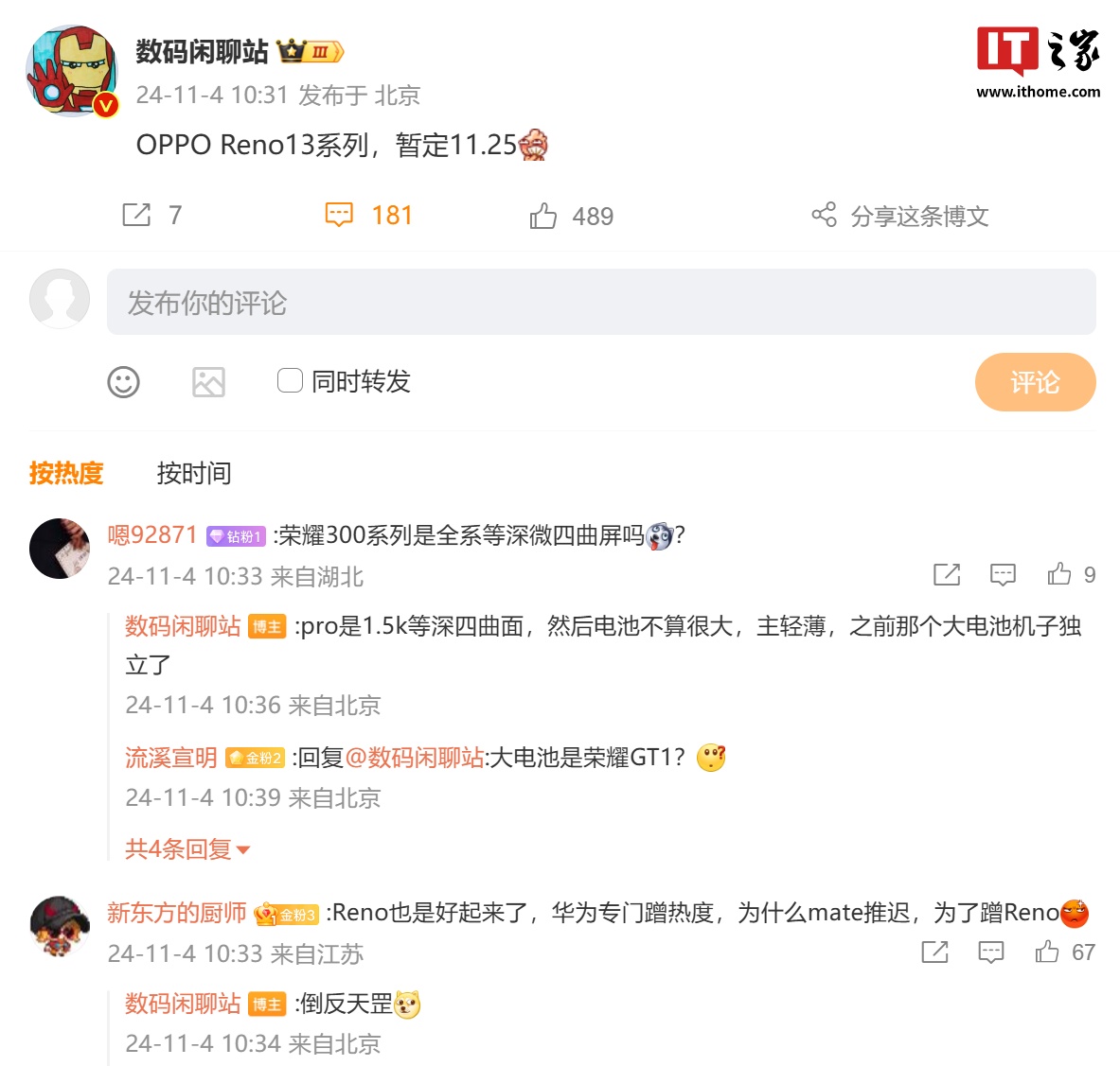 IT之家 11 月 4 日消息,博主 @数码闲聊站 今日透露,OPPO Reno13 系列手机暂定 11 月 25 日发布。