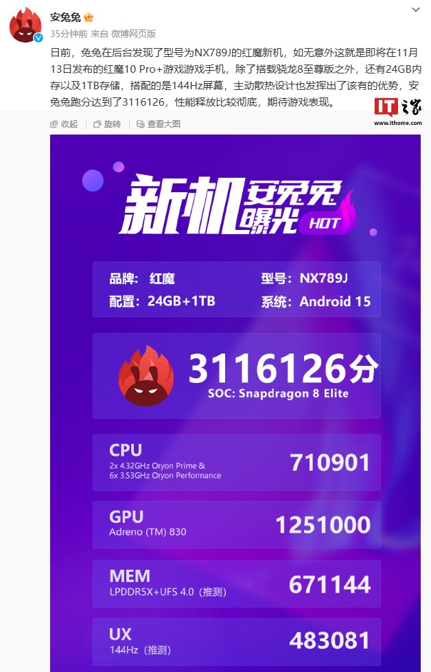 测试机型跑分超 311 万(3116126),搭载高通骁龙 8 至尊版处理器,系统基于 Android 15 打造。该机还配备 24GB+1TB 的存储组合,拥有 144Hz 高刷屏。