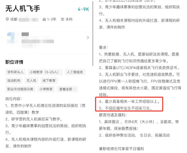而成都另一个薪资4000-9000元之间的无人机飞手岗,也要求最少一年工作经验以上,并表示不招应届毕业生不招实习生。