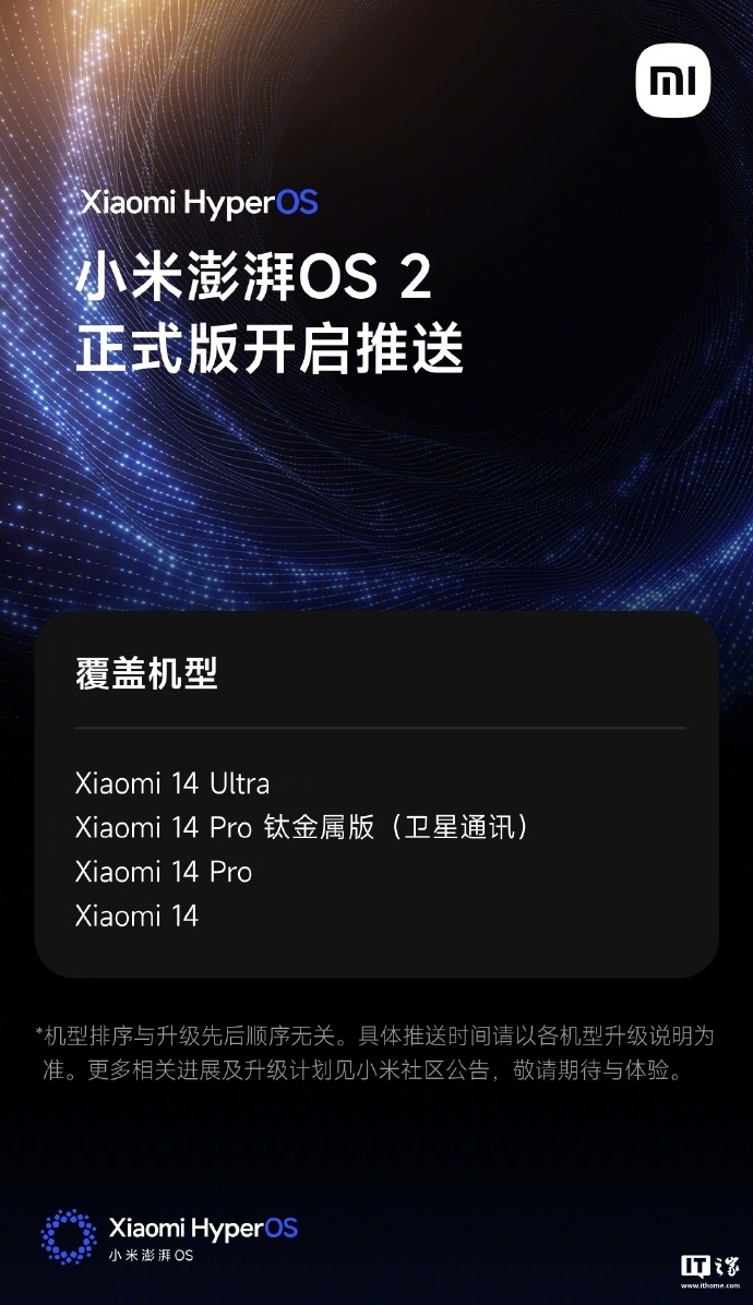 IT之家 11 月 9 日消息,IT之家从小米澎湃 OS 官微获悉,小米澎湃 OS 2 正式版今起面向小米 14 系列(小米 14 / Pro / Pro 钛金属版 / Ultra)开始推送,更多机型陆续覆盖中。