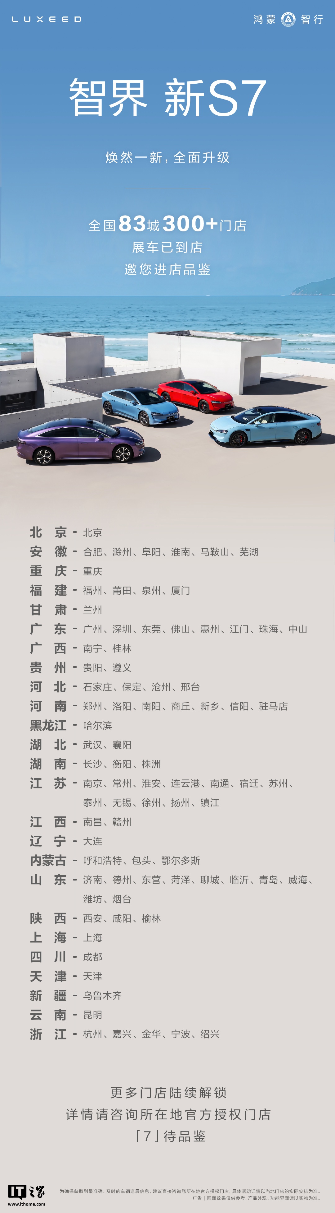 IT之家 11 月 9 日消息,华为终端今日宣布,鸿蒙智行智界新 S7 展车已抵达全国 83 城 300 + 家门店。该车将迎来“焕然一新”的全面升级。