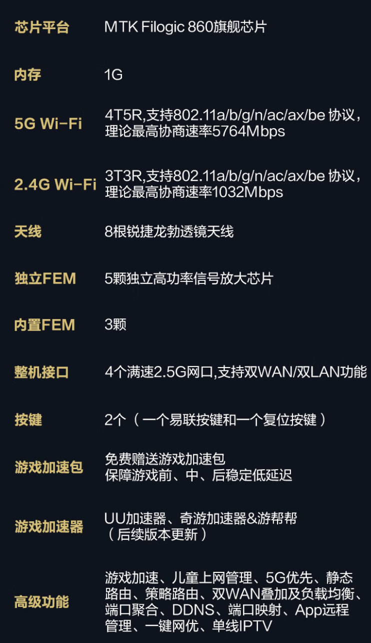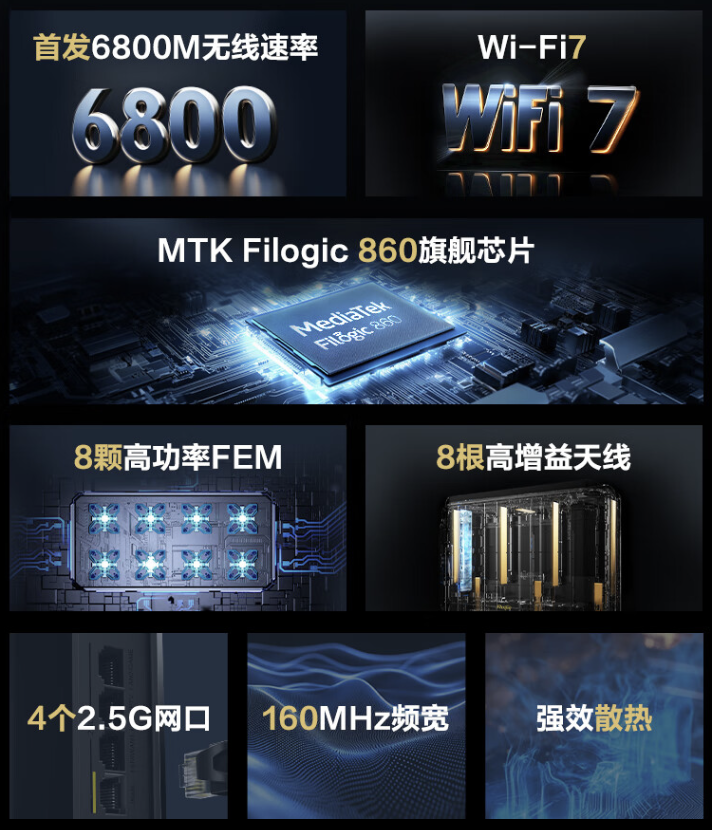此外,该路由器配备 4 个 2.5G 网口,内置 MTK Filogic 860 芯片,配备 1GB RAM。
