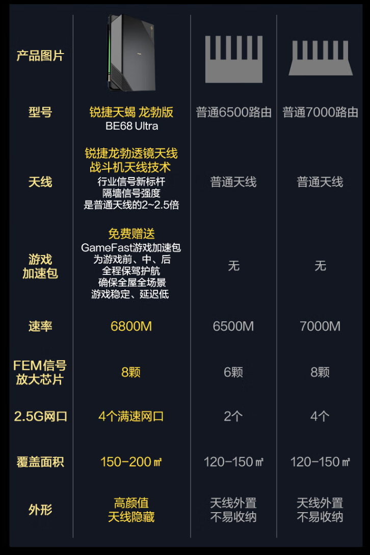 锐捷天蝎龙勃版 BE68 Ultra 双频 6800M 电竞路由器发售于 2024 年 10 月,这款路由器主打“龙勃透镜天线、8 颗信号放大芯片”,首发价 589 元。