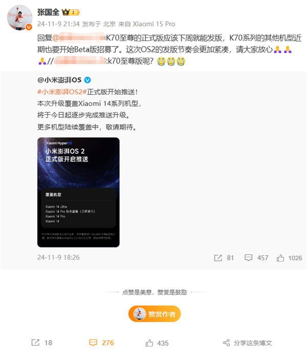 对于网友关心的Redmi K70至尊版什么时候推送更新的问题,小米手机系统软件部总监张国全进行了回应。