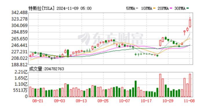 个股方面,特斯拉股价收涨8.19%,涨至321.22美元/股,总市值达到1.03万亿美元,股价盘中一度涨逾10%,刷新2022年4月以来新高,市值突破1万亿美元大关,为2022年以来首次。得益于特斯拉股价飙涨,特斯拉CEO马斯克身家已超过3000亿美元,稳坐全球首富的宝座。
