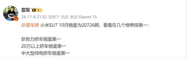 11月8日晚,小米集团董事长兼 CEO雷军在微博发文称,小米SU7在10月的销量为20726辆,并指出该车在多个榜单上均位居榜首,包括新势力轿车销量榜、20万以上轿车销量榜以及中大型纯电轿车销量榜。