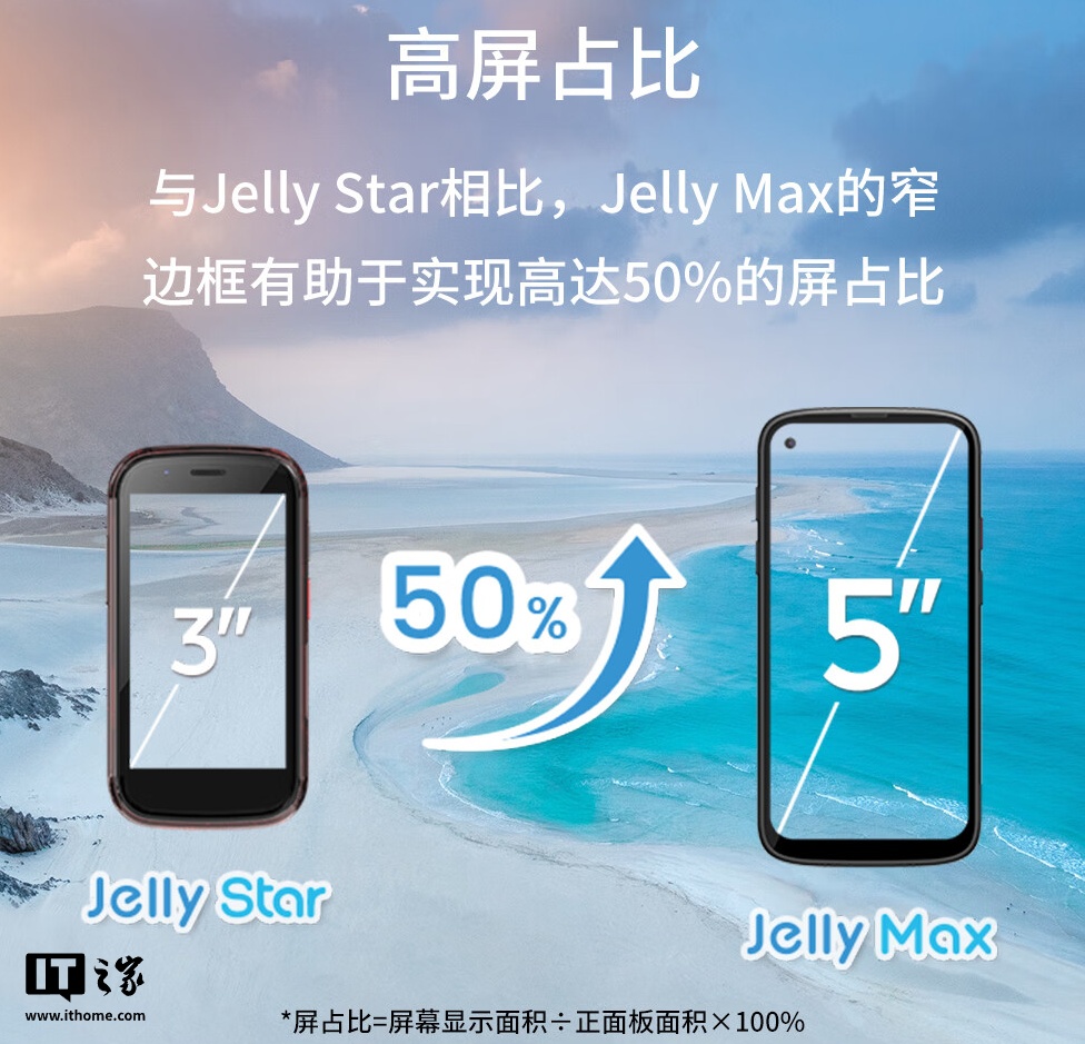 据介绍,Unihertz Jelly Max 手机搭载 5.05 英寸 720×1520 分辨率的 LCD 挖孔屏,机身三围 128.7×62.7×16.3mm,重约 179g。