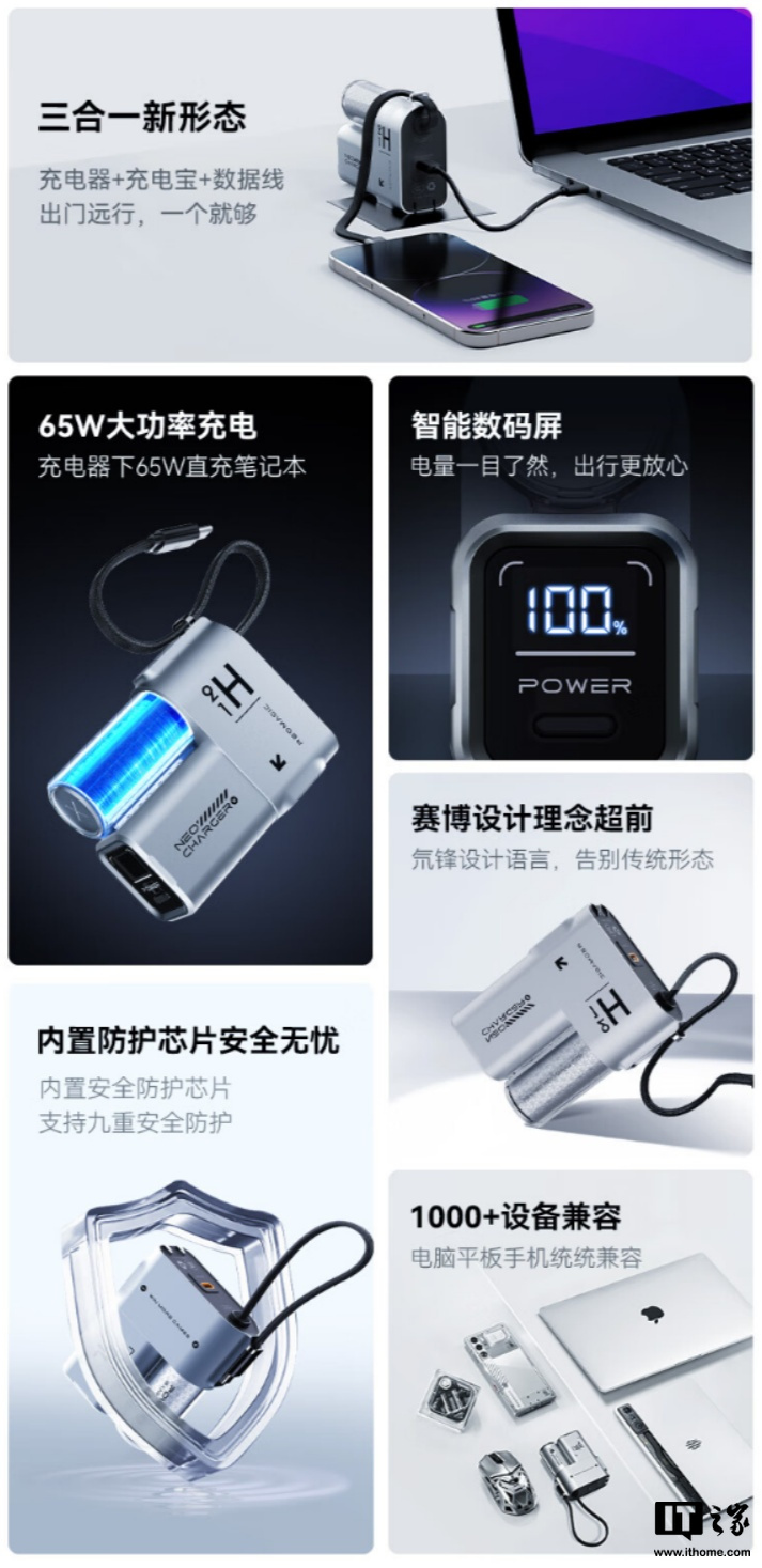 红魔氘锋三合一能量魔方支持 PD 3.0 / QC 3.0 / PPS 快充协议,同时支持自研快充技术 neocharger4.0,可 AI 智能识别协议进行快充。新品还配备数码显示器,顶端提供开关,可查看剩余电量。
