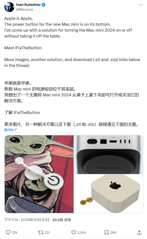 Reddit 用户 @gijsmans3773 今天分享了他针对苹果 M4 款 Mac mini 上电源按钮位于机器底部的解决方法。