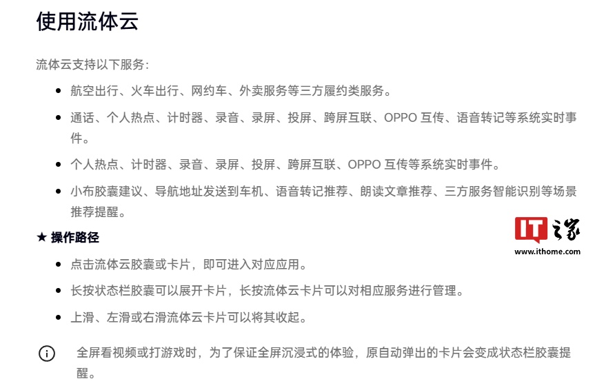 据 OPPO 官网介绍,目前 ColorOS 15 系统流体云功能已支持航空出行、火车出行、网约车、外卖服务等三方履约类服务,以及系统内置应用实时事件等功能,详情如下: