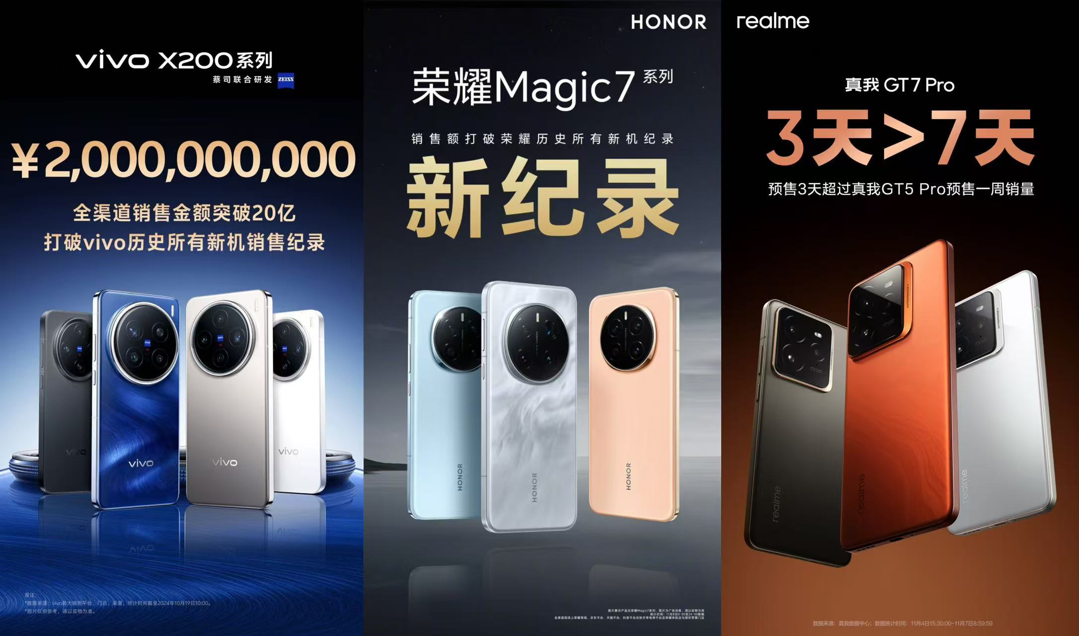 官方资料显示,vivo X200系列首销销售额破20亿、同比上一代增长200%;OPPO Find X8首销日同比Find X7销量增长2.8倍;荣耀Magic7 系列首销销售额打破荣耀历史所有新机纪录;真我GT7 Pro三天预售量大于GT5 Pro 5天预售量等等。
