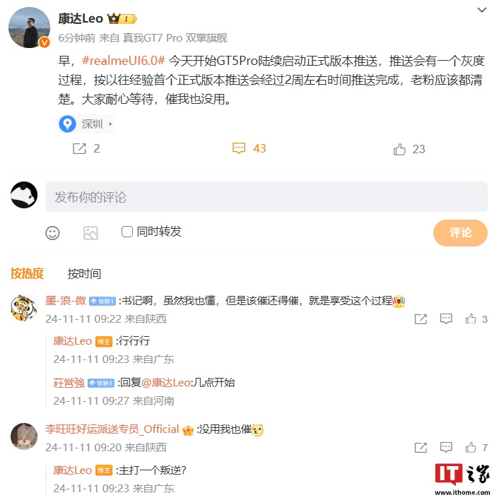 IT之家 11 月 11 日消息,真我 GT5 Pro 手机今日起将陆续启动 realme UI 6.0 正式版本推送,realme UI 产品经理 @康达Leo 今日发文称,推送会有一个灰度过程,按以往经验首个正式版本推送会经过 2 周左右时间推送完成。