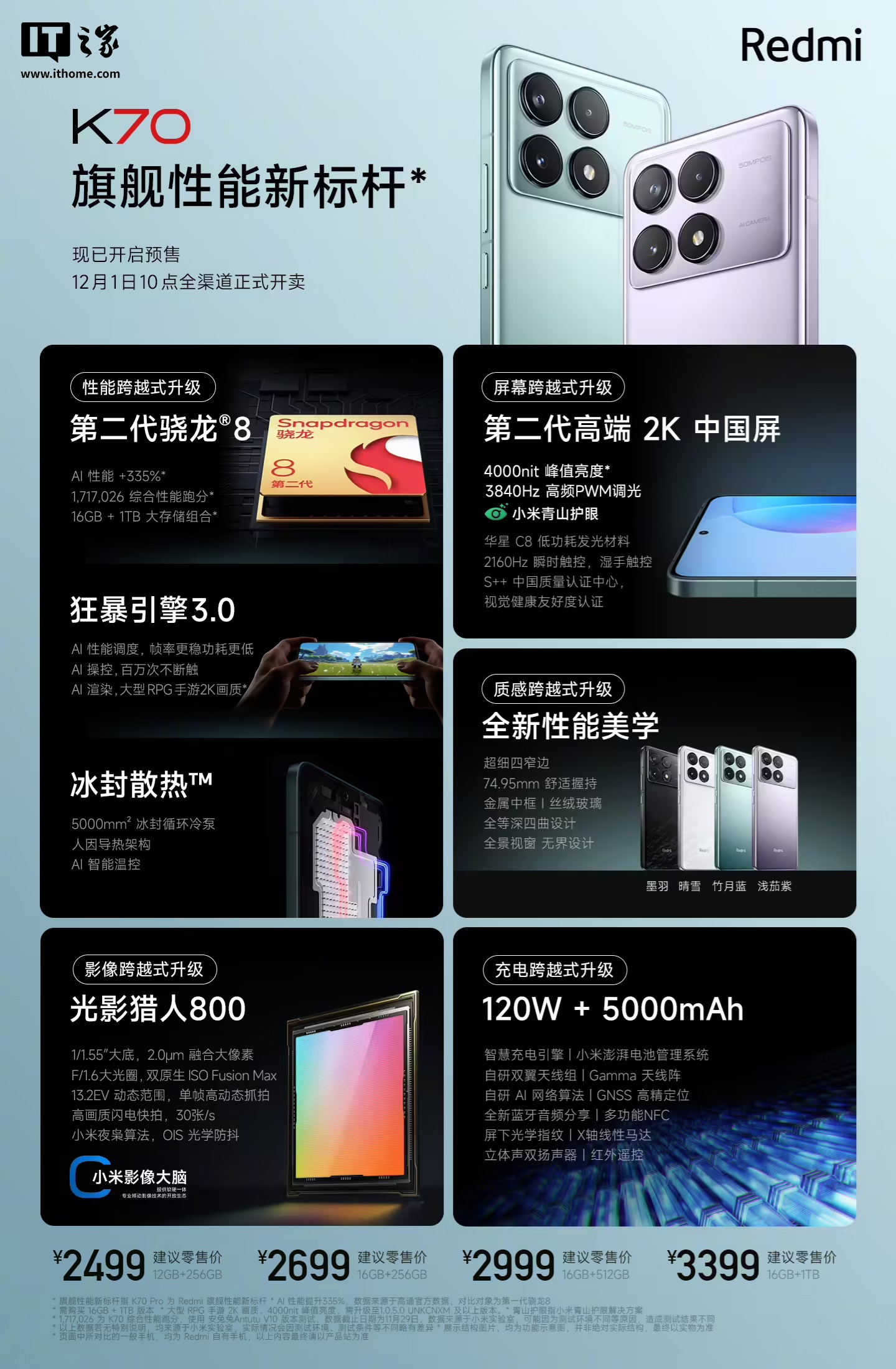 性能方面,Redmi K70 搭载第二代骁龙 8,综合跑分超 171 万,辅以 LPDDR5X 内存,UFS 4.0 闪存,支持狂暴引擎 3.0、5000mm² 环形冷泵 VC 液冷散热。