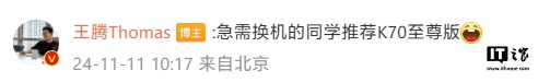 王腾再次提到了新机型 Redmi K80 系列,称其为“新的冠军”,并透露其“在路上了,稍等”。与此同时,他在评论区中还向用户喊话:急需换机的同学推荐 Redmi K70 至尊版。
