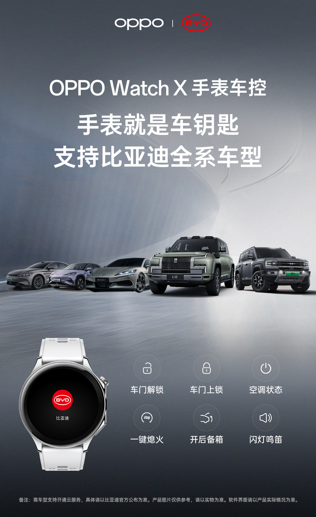 参考官方海报,OPPO Watch X 手表支持控制比亚迪汽车车门解锁、车门上锁、开 / 关后备箱、闪灯鸣笛、一键熄火等功能。