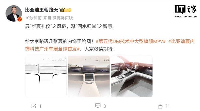 IT之家 11 月 11 日消息,今天下午,比亚迪王朝网销售事业部总经理路天展示了全新 MPV 车型“夏”的内饰手绘设计图。