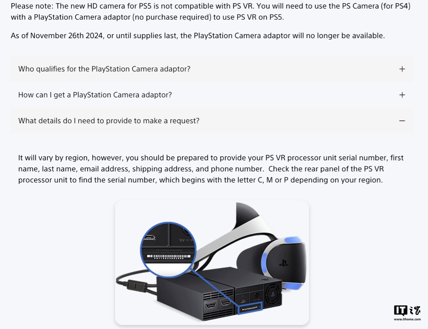 IT之家 11 月 11 日消息,索尼官方支持页面显示,该公司将停止提供 PlayStation Camera 的免费适配器。这个适配器允许 PlayStation Camera 连接到 PS5,从而与索尼初代 PS VR 兼容。