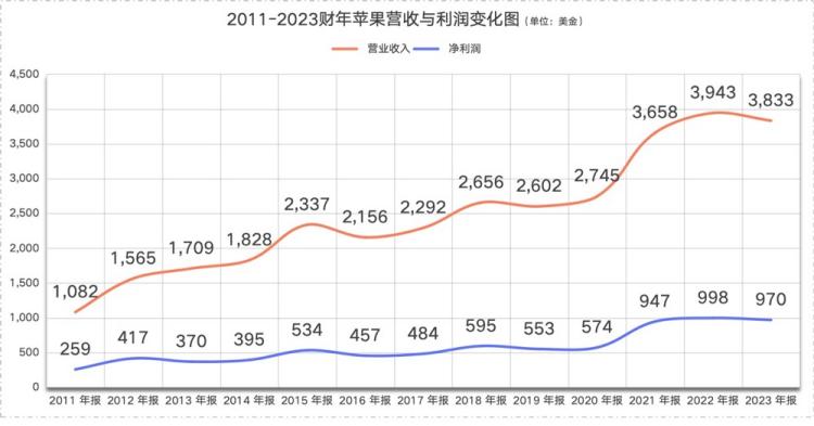 乔布斯去世后,十二年间,苹果的营收从1082亿美金增长到了3833亿美金,增幅三倍;利润则从259亿美金,增长到了970亿美金,增幅近四倍。