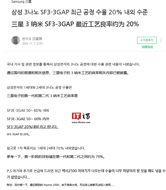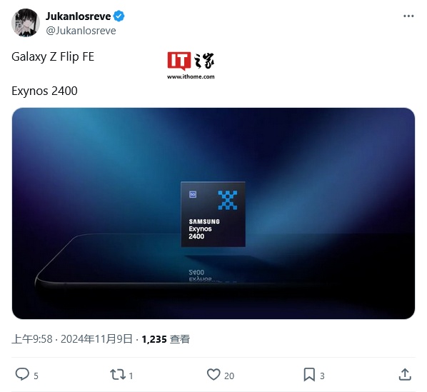 IT之家 11 月 12 日消息,消息源 @Jukanlosreve 于 11 月 9 日在 X 平台发布推文,曝料三星 Galaxy Z Flip FE 手机将搭载 Exynos 2400 芯片。