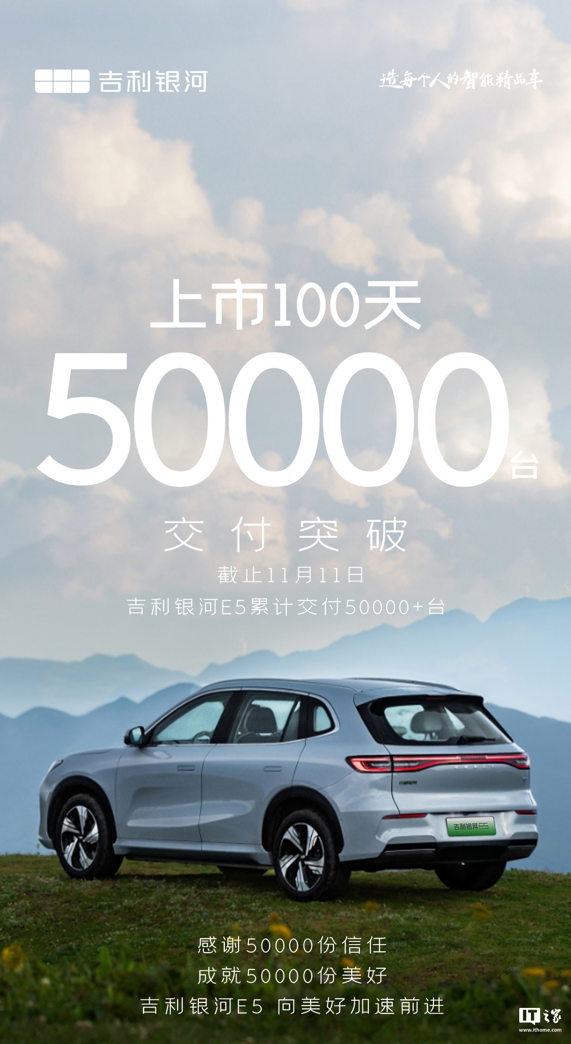 IT之家 11 月 12 日消息,吉利银河新能源今日官宣,吉利银河 E5 纯电 SUV 上市 100 天,交付已突破 5 万辆。