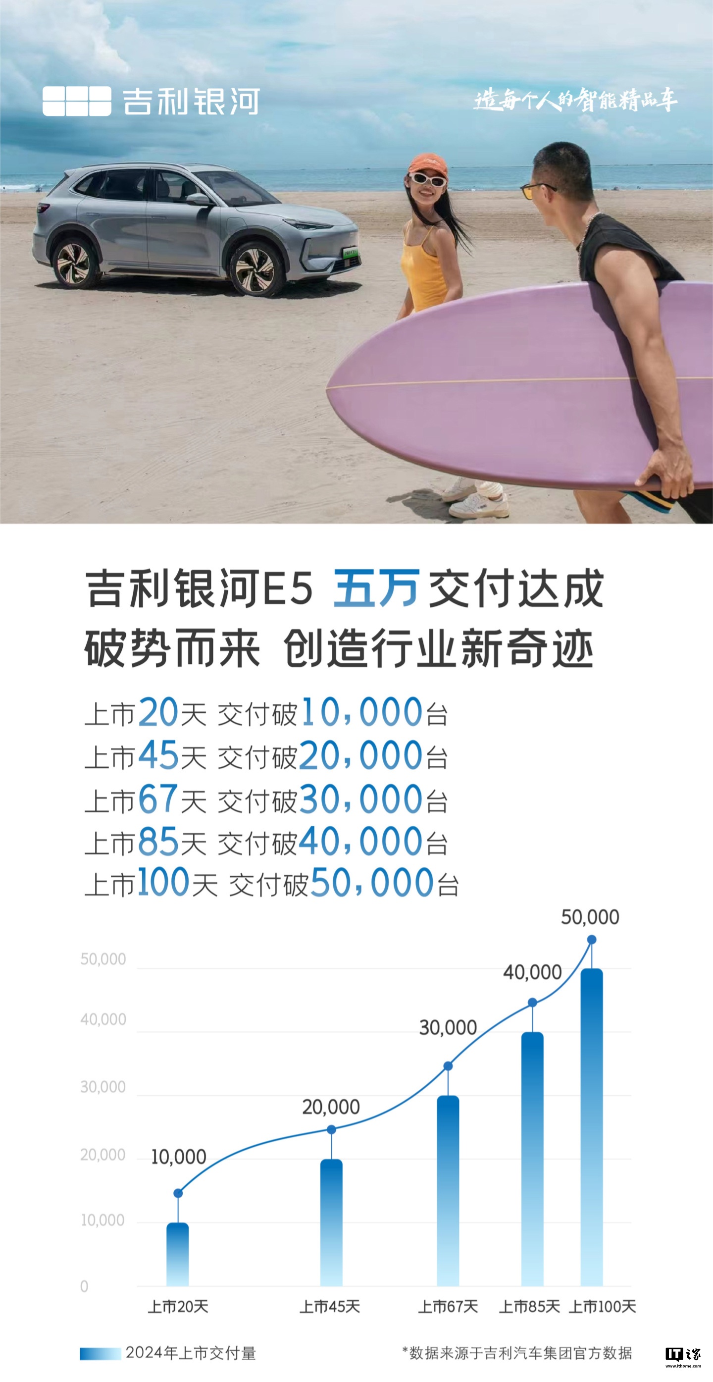 IT之家注意到,吉利银河 E5 上市 20 天交付突破 1 万辆,此后交付量平稳增长,平均每 20 天左右交付 1 万辆。