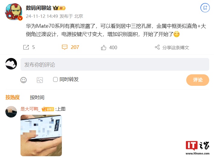 IT之家 11 月 12 日消息,博主 @数码闲聊站 今日发文称,华为 Mate70 系列有真机泄露了,可以看到居中三挖孔屏,金属中框类似直角 + 大倒角过渡设计,电源按键尺寸变大,增加识别面积。
