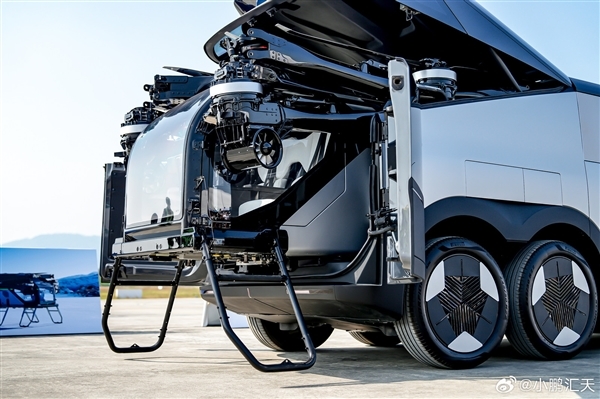 其中,“陆地母体”为3轴6轮,长宽高分别约为5.5米、2米、2米。采用全域800V碳化硅高压增程平台,续航里程超1000公里,同时能在行驶和停车时为飞行器充电,支持5-6次飞行。