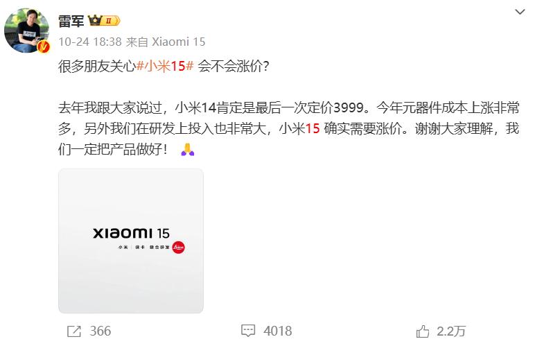 从小米14系列开始,雷军就向“米粉”透露,这将是最后一次定价在3999元。“今年3nm工艺升级,同时供应链RAM和ROM成本涨幅很大,我们在研发上的投入也非常大,小米15确实需要涨价。”