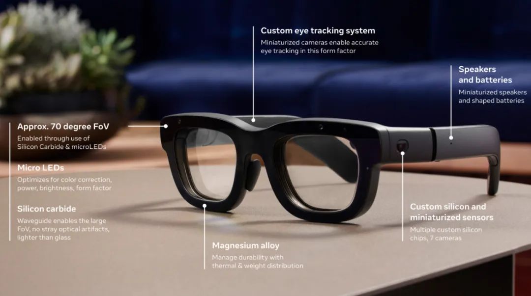 Meta Orion极为罕见地将碳化硅晶圆取代玻璃做衍射光波导基底,碳化硅超过2.0的材料折射率将FOV虚像视野提升到70度,可谓前所未有。Meta Orion在一副100克左右的眼镜上集成了来自JBD合色方案的Micro LED全彩显示的光引擎、复杂的多片衍射波导、电池、无线高速数据传输、高精度的眼球追踪、视觉SLAM等完备且先进的AR人机交互手段,还有融合了Meta强大的端侧小模型。