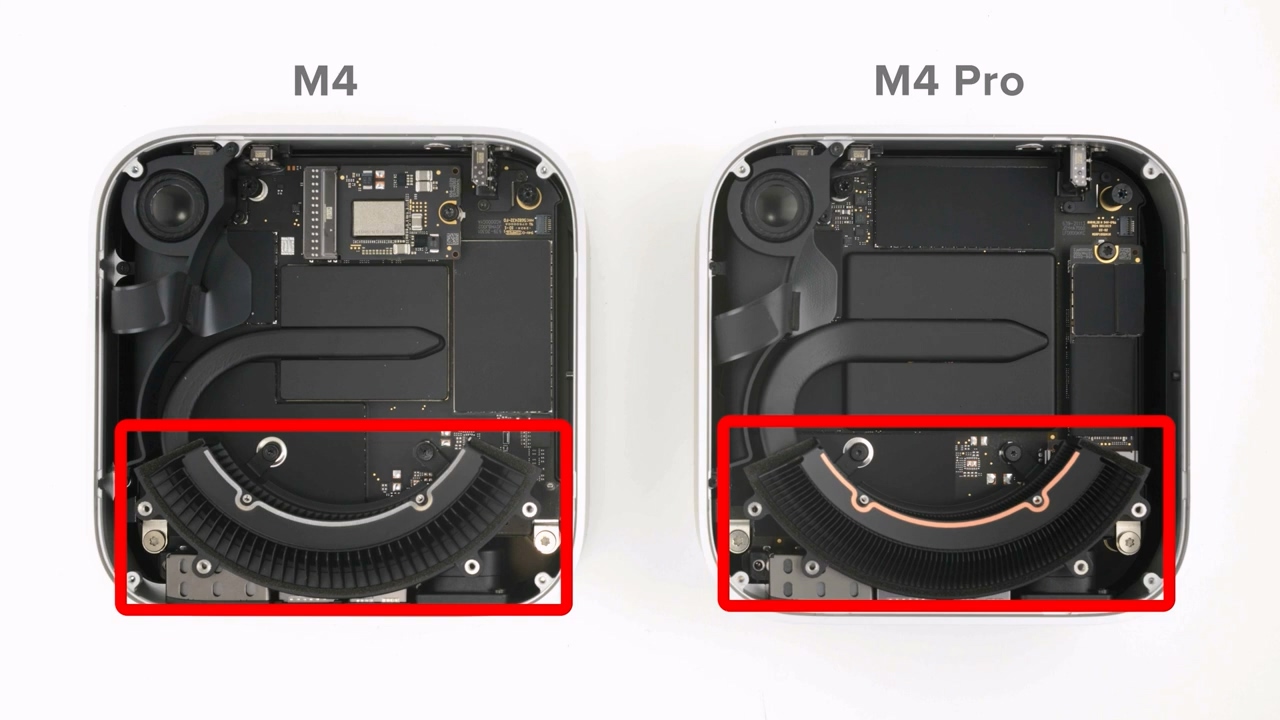 M4 Mac Mini 的中间配备了风扇,搭载重新设计的热管理系统。该系统通过从外界吸入空气,循环经过各个层级,最后从底部排出,确保设备的稳定运行。对于需要更多散热能力的 M4 Pro 版本,苹果则使用了更大的铜散热器。