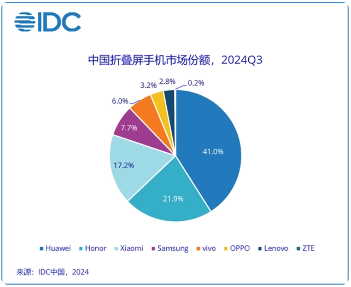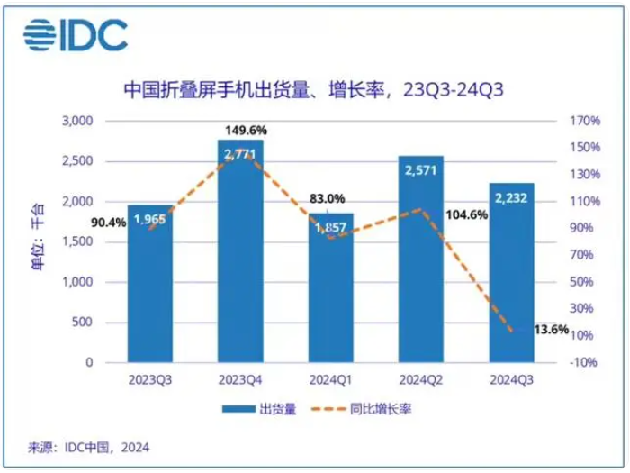 IDC数据显示,2024年三季度,中国折叠屏手机出货量达到了223万台,尽管与前一年同期相比保持增长,但增速已明显放缓,较之前八个季度的增长势头有所减弱。