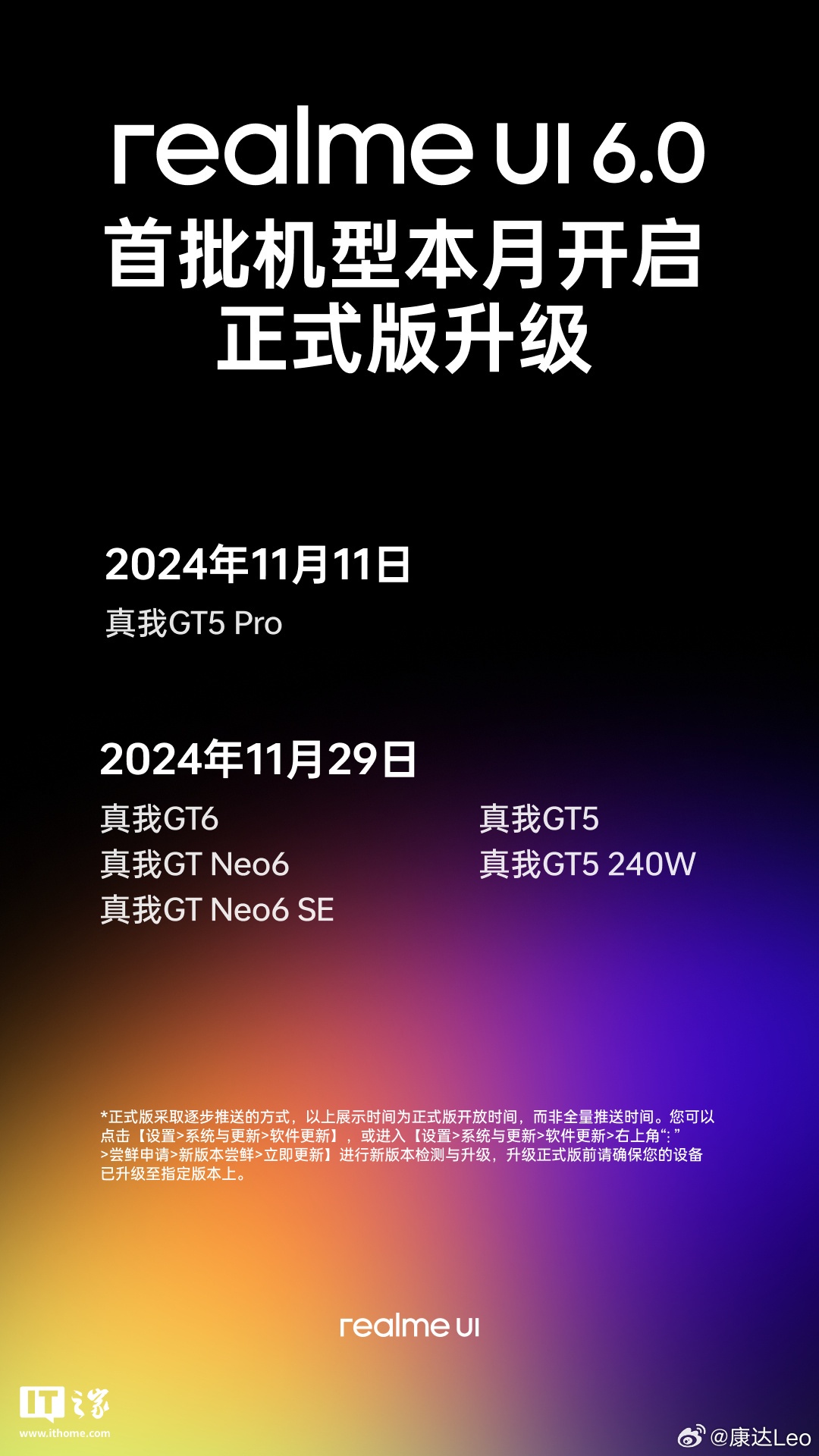 IT之家 11 月 13 日消息,真我 GT5 Pro 手机已于今年 11 月 11 日起将陆续启动 realme UI 6.0 正式版本推送,预计 2 周左右时间推送完成。