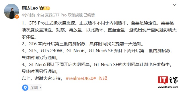realme UI 产品经理 @康达Leo 今日发文公布了新系统后续推送情况,详情如下: