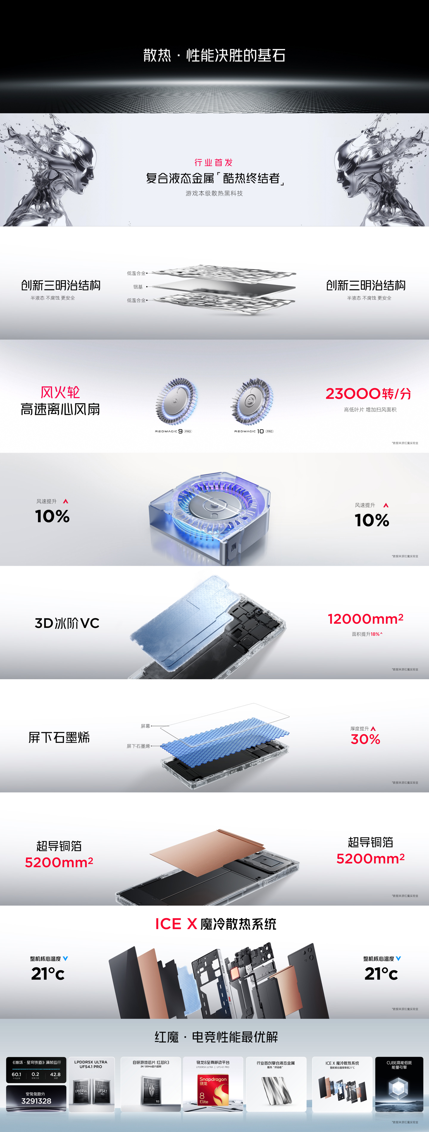 红魔 10 Pro 系列手机使用 10 层魔冷散热,采用创新三明治结构设计,内置全新“风火轮”高速离心风扇(转速 23000 转 / 分)。此外,新机还配备 3D 冰阶 VC ⾯积提升 18% 至 12000mm²、5200mm² 超导铜箔。