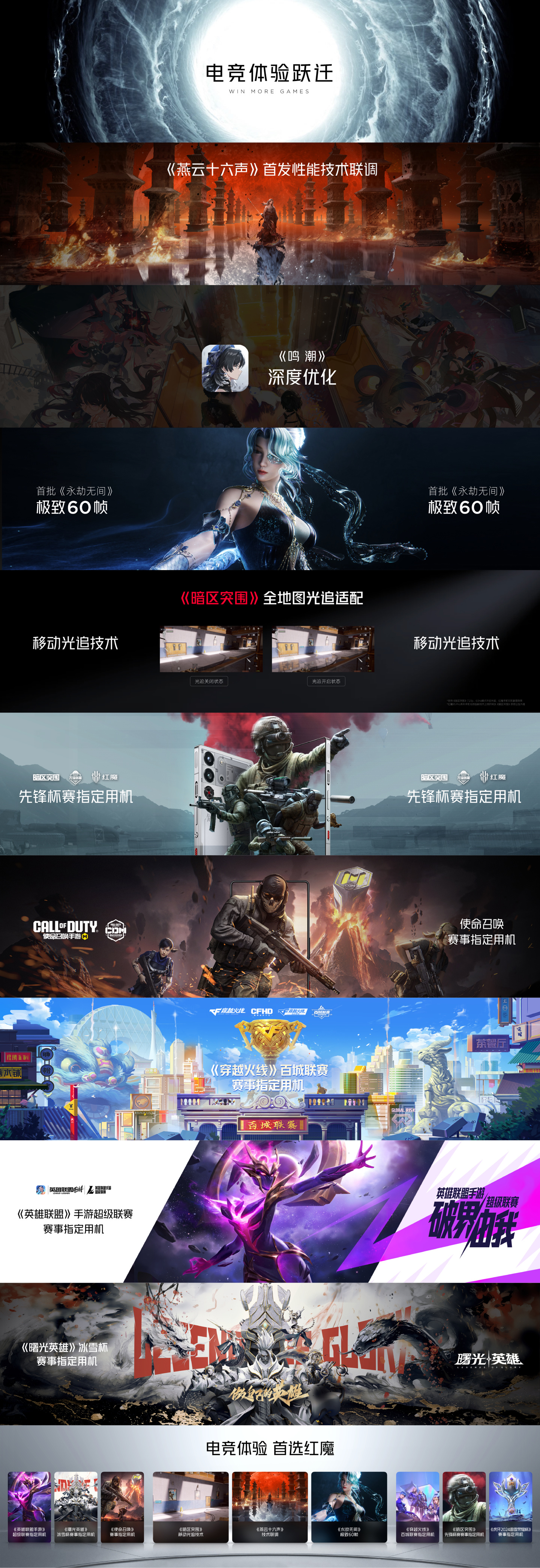 红魔 10 Pro 系列手机还针对游戏进行优化:《燕云十六声》手游首发性能技术联调、《鸣潮》手游深度优化、《永劫无间》手游极致 60 帧首批适配、《暗区突围》手游全地图光追适配。