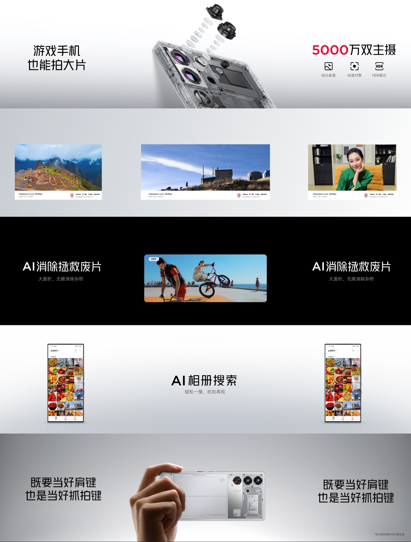 此外,红魔 10 Pro 系列手机还配备 5000 万双主摄,支持“低光夜景、快速对焦、HDR 模式”、前摄支持三重 AI 屏下摄像技术、相册支持 AI 消除、AI 搜索功能。