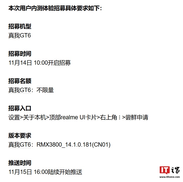 IT之家 11 月 13 日消息,realme UI 官方今日在社区宣布,realme UI 6.0 第三轮内测用户招募将于 11 月 14 日正式开启,选定真我 GT6 作为第三轮招募机型。
