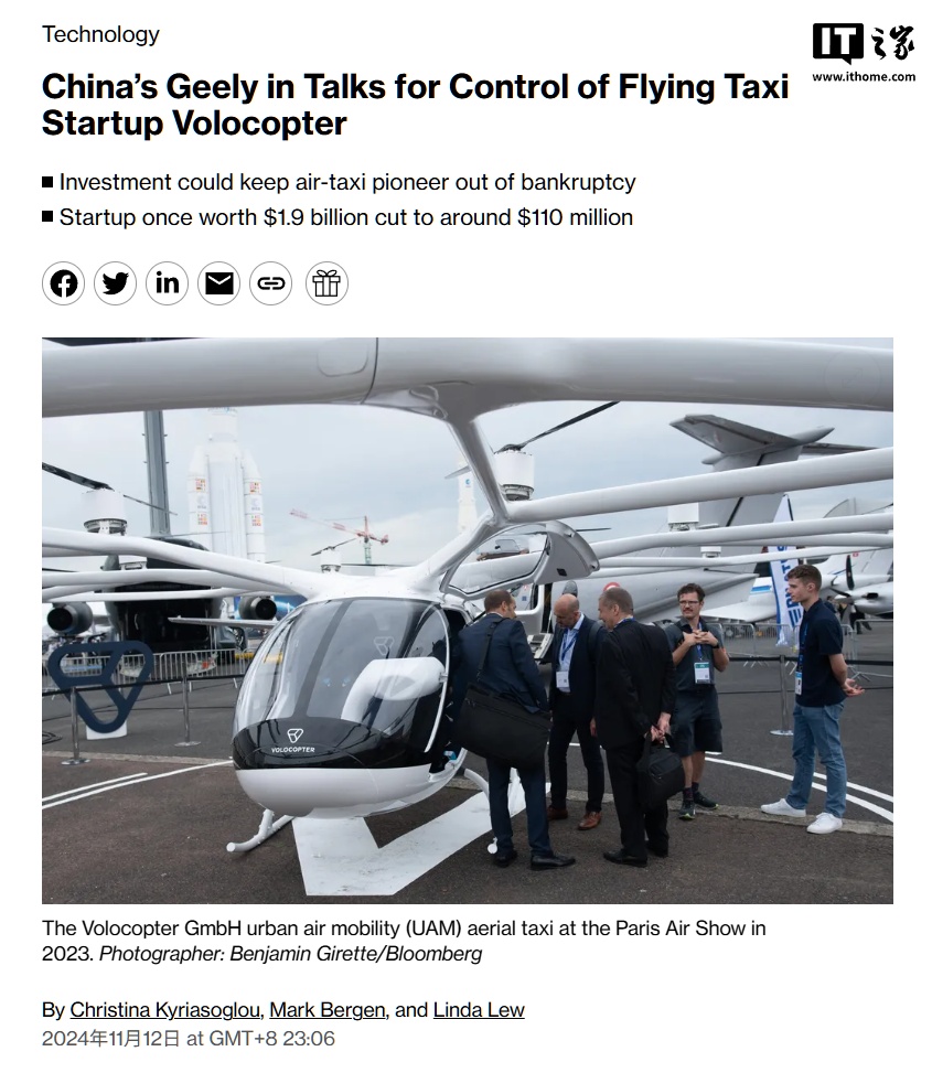 IT之家 11 月 13 日消息,据彭博社 12 日援引知情人士消息称,吉利集团正在与德国飞行出租车公司 Volocopter Gmbh 进行深入洽谈,准备收购并控股该公司,以帮助其摆脱潜在破产的危机。